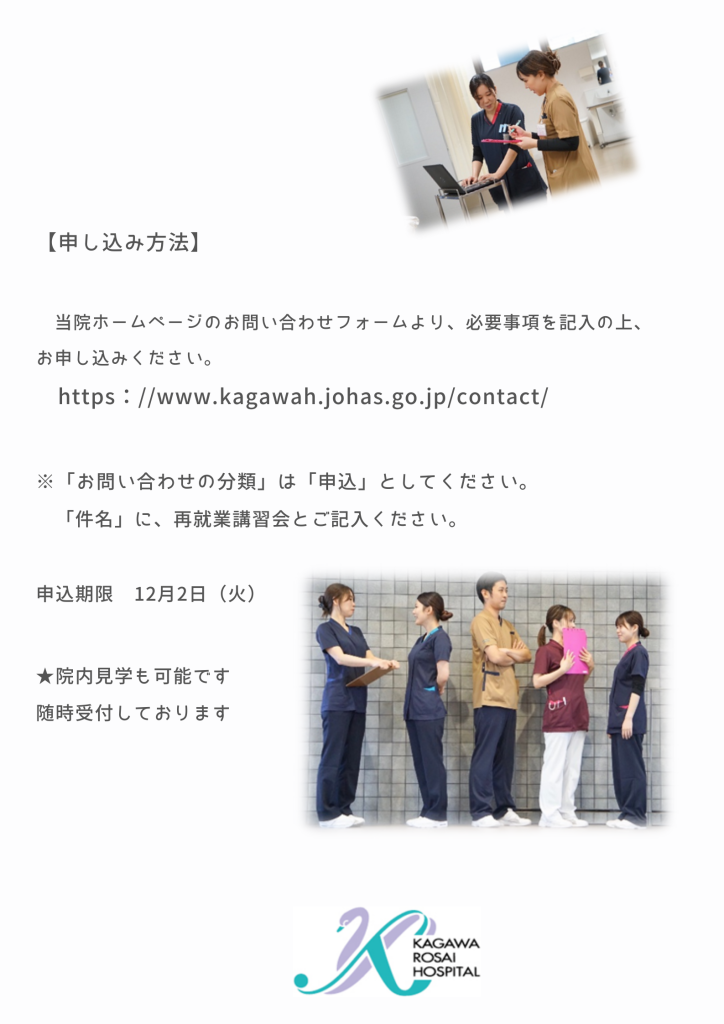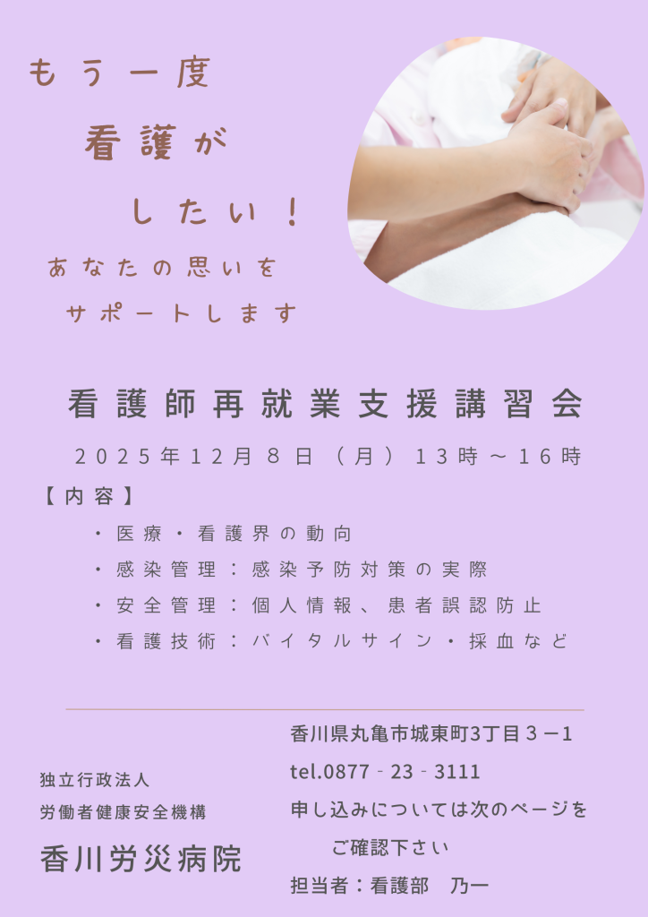 詳しい研修内容および参加希望の方は、別添の看護師再就業支援講習会のご案内をご確認ください。