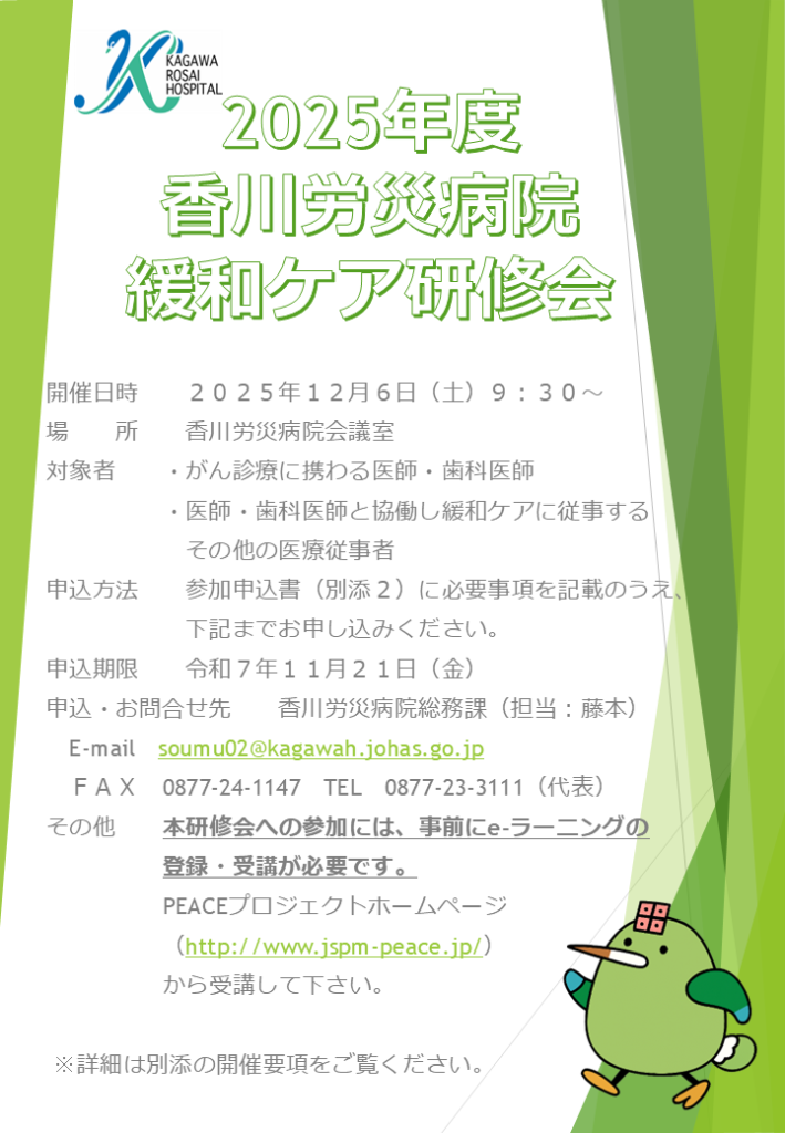2025年10月21日 がん医療医療関係者向け 香川労災病院緩和ケア研修会開催のお知らせ 当院では、この度下記のとおり緩和ケア研修会の開催を予定しております。参加ご希望の方は、以下の案内を確認していただき、期日までにお申込みくださいますようお願いいたします。 緩和ケア研修会開催のご案内ダウンロード 参加申込書ダウンロード