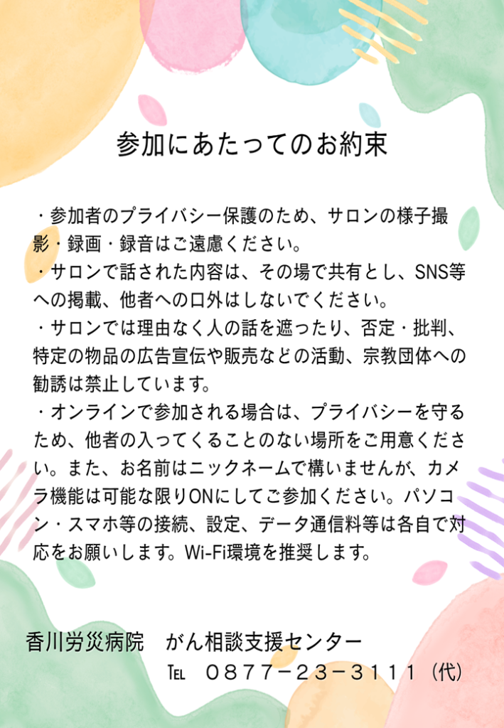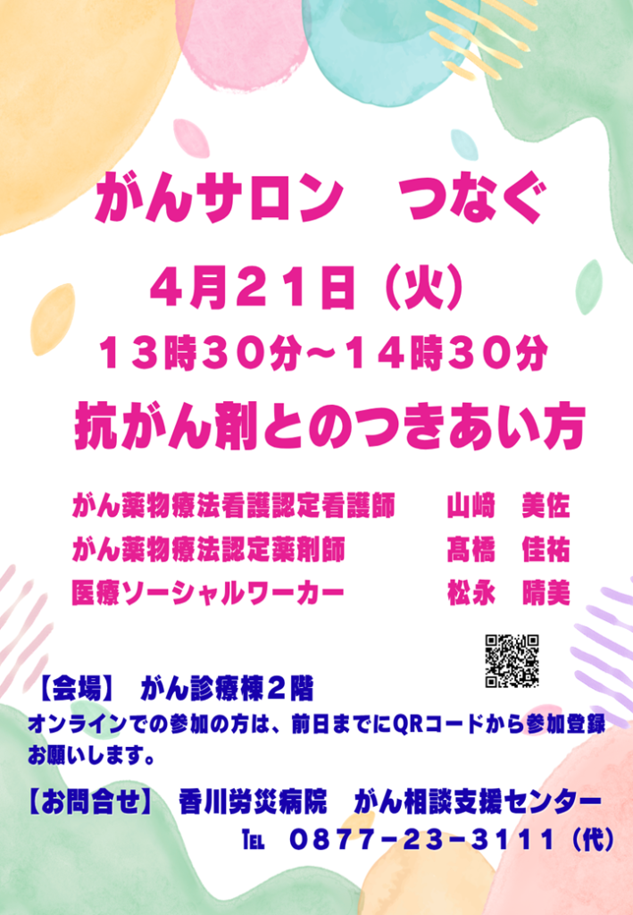 2026年3月26日 患者様向けがん医療 がんサロン4月開催のご案内 こんにちは、がん相談支援センターです。4月21日(火)は、がん薬物療法看護認定看護師 山﨑 美佐、がん薬物療法認定薬剤師 髙橋 佳祐、医療ソーシャルワーカー 松永 晴美が「抗がん剤とのつきあい方」について話します。がん治療経験の有無にかかわらず、がんについて知りたい方などどなたでも参加していただけます。ぜひ、お越しください。 がんサロンのご案内ダウンロード